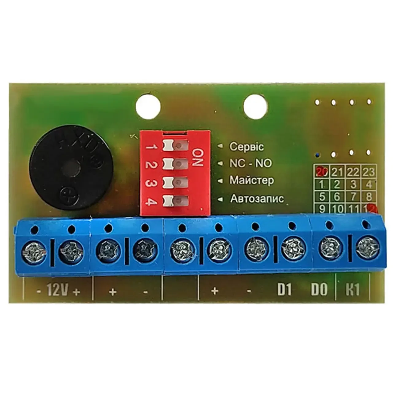 - Вибір типу замку DIP перемикачем, настроювання часу відкривання замка від 1 до 60 с.